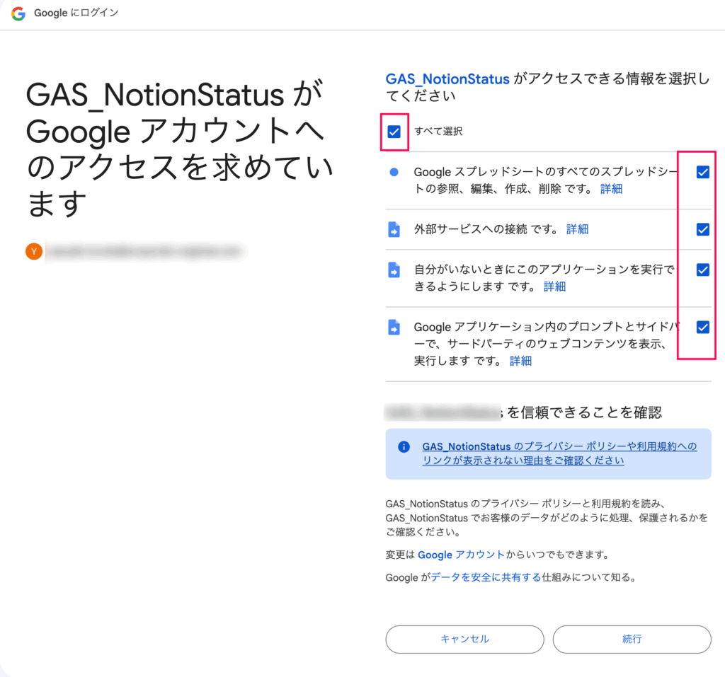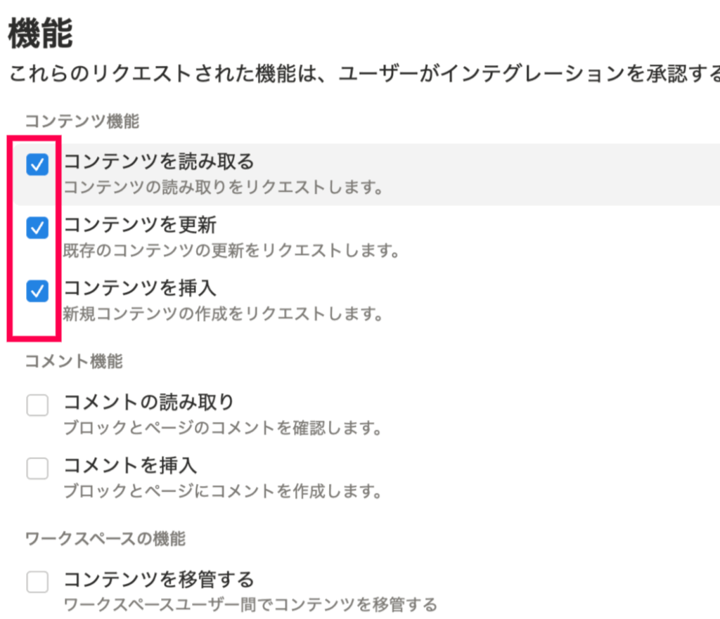 外部ツール(GAS)からNotionを操作するためこちらのリンクからインテグレーションを作成して控えておいて下さい。なお今回はステータス変更を行うので更新権限も付与して下さい。