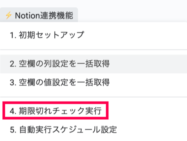 メニューの 「4. 期限切れチェック実行」 をクリックします。 「実行ログ」列に「更新: 〇件」と表示されれば、正常に動作しています。Notion側でステータス変更と設定した通知が届くことを確認してください。
