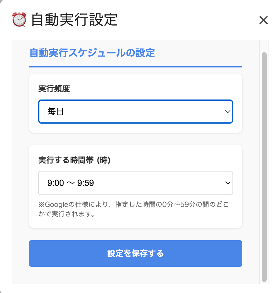<div class="note">※Googleの仕様により、指定した時間の0分〜59分の間のどこかで実行されます。</div>