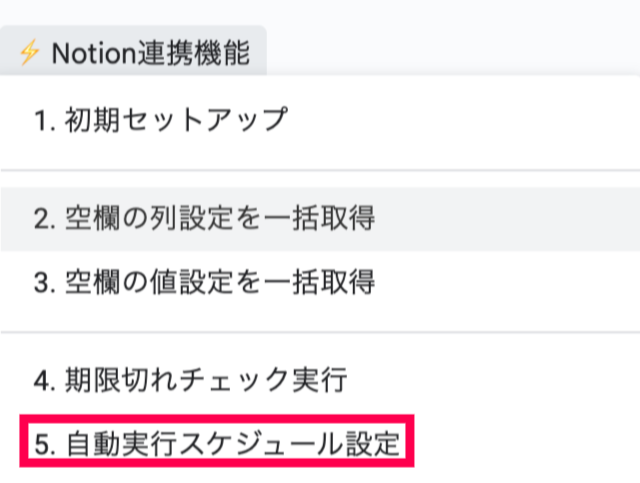 .addItem('5. 自動実行スケジュール設定', 'showTriggerSettingsDialog')
