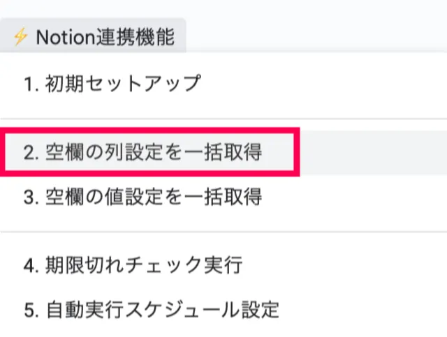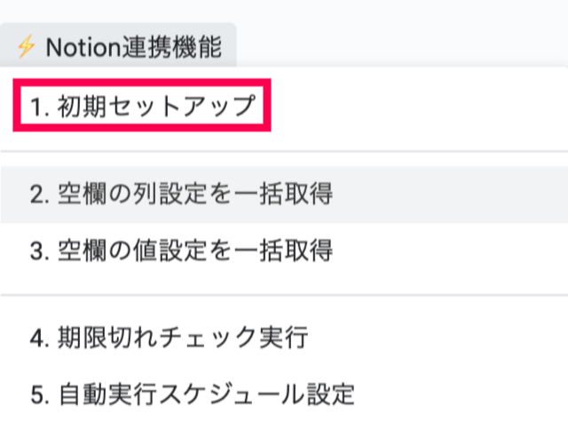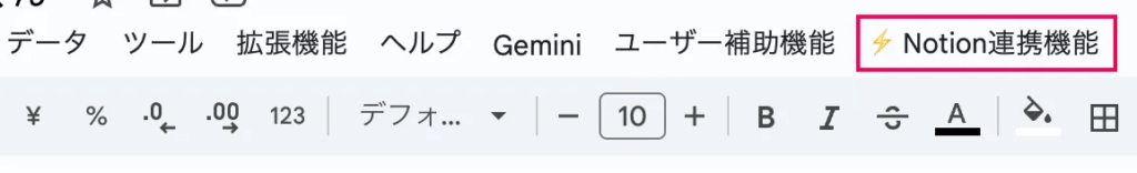 GASを保存後にGoogleスプレッドシートを更新するとメニューバーに 「⚡ Notion連携機能」 が表示されますので以下手順を実施してください。