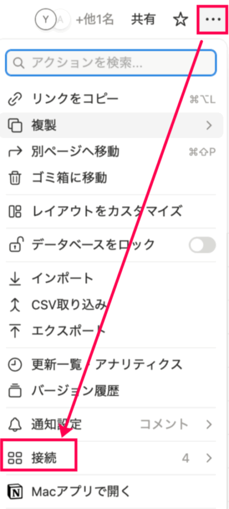 Notion APIキーを作成したら、対象のデータベースの右上「…」から「接続」 を選択しコネクトの追加を行って下さい。
