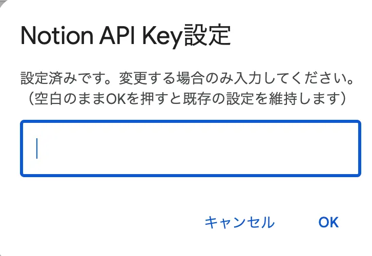 3.Notion APIキー の入力画面が表示されるので、控えていたAPIキーを貼り付けて下さい。