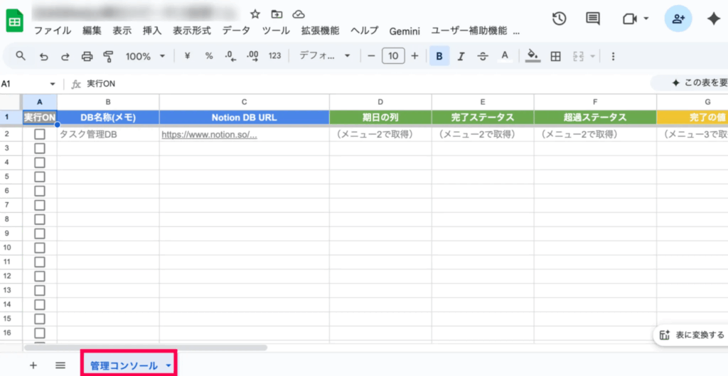- GoogleスプレッドシートにNotionのデータベースURLを貼るだけで、必要なパラメータ(列名や選択肢)を自動で取得します。