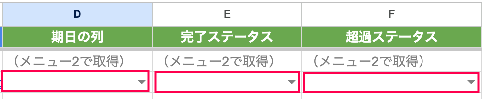 メニューから[2.空欄の列設定の一括取得]をクリックして下さい。実行すると以下のようなプルダウンが出来るので期日や完了、追加ステータスの列を設定して下さい。