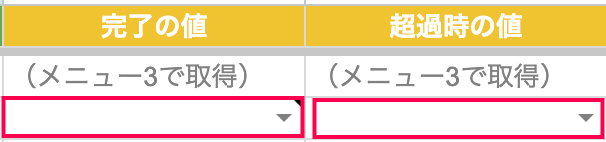 D~F列をすべて穴埋めしたらメニューから[3.空欄の値設定の一括取得]をクリックして下さい。実行すると以下のようなプルダウンが出来るので完了時の値と超過時に設定する値を指定して下さい。