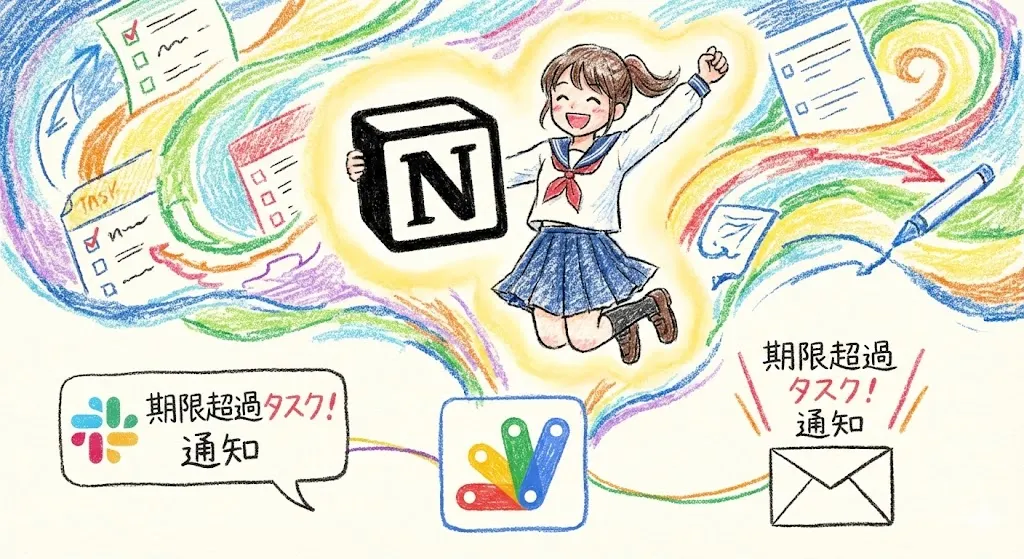 - 毎日(または指定日時)にNotionデータベースをチェックし、期日が「昨日以前(今日を含まない)」になっているタスクを抽出します。